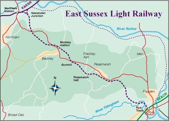 Rather than following the Rother flood plain, Stephens proposed a route that diverged from the RVR with a triangular junction just east of Northiam station and climbed steeply into the higher ground to the south-west, paralleling the present A268 and passing close to Beckley and Peasmarsh before descending into the valley of the River Tillingham. This would have given an easier approach to Rye compared to the narrow shelf between Rye Hill and the Rother, which was already well developed by the end of the 19th century.